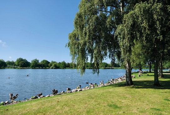 Sydvendt terrasse med direkte udsigt til Haderslev Dam og park. Lækker stilfuld indrettet niveauopdelt restaurant med panoramaudsigt.