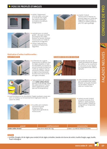 gratté : découper le profilé à la longueur de l’arête. Réaliser un boudin d’enduit monocouche sur l’arête et positionner la baguette ¡¡ utiliser l’adjuvant pour accélérer la fixation des baguettes