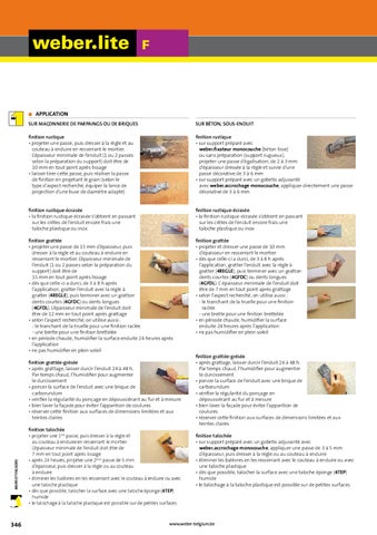 finition rustique • sur support préparé avec weber.fixateur monocouche (béton lisse) ou sans préparation (support rugueux), projeter une passe d’égalisation, de 2 à 3 mm d’épaisseur dressée à la règle et suivie d’une passe décorative de 3 à 6 mm • sur support préparé avec un gobetis adjuvanté avec weber.accrochage monocouche, appliquer directement une passe décorative de 3 à 6 mm