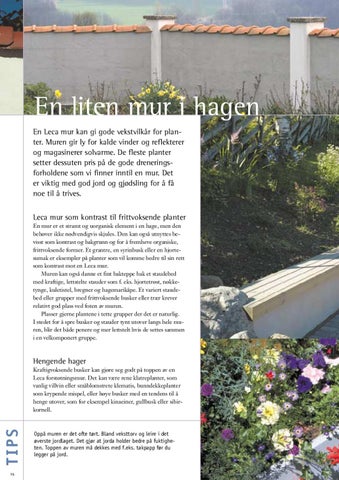 En liten mur i hagen En Leca mur kan gi gode vekstvilkår for planter. Muren gir ly for kalde vinder og reflekterer og magasinerer solvarme. De fleste planter setter dessuten pris på de gode dreneringsforholdene som vi finner inntil en mur. Det er viktig med god jord og gjødsling for å få noe til å trives. Leca mur som kontrast til frittvoksende planter En mur er et stramt og uorganisk element i en hage, men den behøver ikke nødvendigvis skjules. Den kan også utnyttes bevisst som kontrast og bakgrunn og for å fremheve organiske, frittvoksende former. Et grantre, en syrinbusk eller en hjortesumak er eksempler på planter som vil komme bedre til sin rett som kontrast mot en Leca mur. Muren kan også danne et fint bakteppe bak et staudebed med kraftige, lettstelte stauder som f. eks. hjortetrøst, nøkketynge, kuletistel, bregner og hagemarikåpe. Et variert staudebed eller grupper med frittvoksende busker eller trær krever relativt god plass ved foten av muren. Plasser gjerne plantene i tette grupper der det er naturlig. I stedet for å spre busker og stauder tynt utover langs hele muren, blir det både penere og mer lettstelt hvis de settes sammen i en velkomponert gruppe.