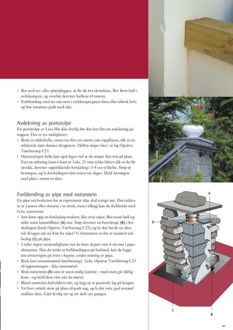 Forblending av pipe med naturstein En pipe må beskyttes for at regnvannet ikke skal trenge inn. Det enkleste er å pusse eller slemme i to strøk, men i tillegg kan du forblende med f.eks. naturstein. Sett først opp en forskaling nederst, like over taket. Bor noen hull og stikk noen kamstålbiter (A) inn. Støp deretter en bærekrage (B) i forskalingen (bruk Optiroc Tørrbetong C25), og la den herde en ukes tid. Kragen må stå fritt fra taket! Vi forutsetter at det er montert takbeslag (C) på pipa. Under ingen omstendigheter må du bore dypere enn 6 cm inn i pipeelementet. Har du tenkt ut forblendingen på forhånd, kan du legge inn armeringen på tvers i fugene, under muring av pipa. Bruk kun sementmørtel (tørrbetong), f.eks. Optiroc Tørrbetong C25 til oppmuringen - ikke murmørtel. Bruk naturstein (D) som er mest mulig kantete - rund stein gir dårlig feste - og hold dem våte når du murer. Bland mørtelen forholdsvis stiv, og legg ut et passende lag på kragen. Vri hver enkelt stein på plass til godt sug, og la det være god avstand mellom dem. Gjør ferdig ett og ett skift om gangen.