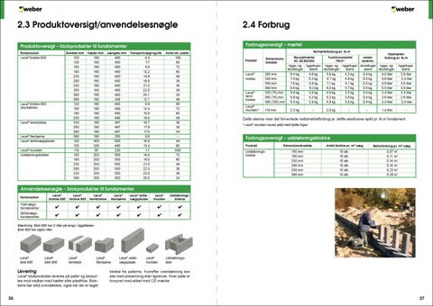 Dette skema viser det forventede nettomørtelforbrug pr. skifte eksklusive spild pr. lb.m fundament. * Leca® mursten mures altid med fyldte fuger