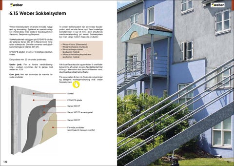 6.15 Weber Sokkelsystem Weber Sokkelsystem anvendes til både nybyggeri og renovering. Systemet er specielt velegnet i forbindelse med Webers facadesystemer: Serporoc, Serpomin og Serposol. Sokkelsystemet opbygges på EPS/XPS-plader, der påføres Serpo 260 EF-A fiberarmeret mineralsk sokkelpuds. Derefter armeres med glasfiberarmeringsnet (Serpo 397 EF). EPS/XPS-pladen leveres i forskellige pladetykkelser. Der pudses min. 20 cm under jordniveau. Under jord: For at hindre vandindtrængning i pudsen svummes der to gange med weber.tec. 824. Over jord: Her kan anvendes de nævnte farvede produkter.