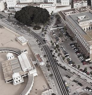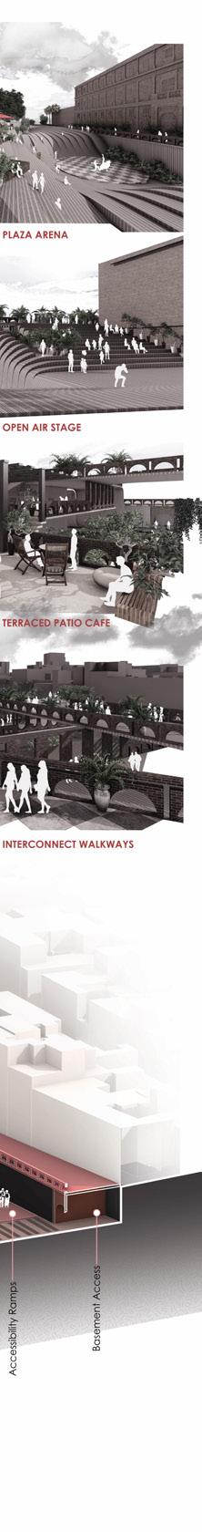 The plaza becomes the building in this design proposal. The floors dont inland city which lies 5 metres below in its natural terrain. The design proposal platforms which includes open stage, parking, shops, dining and work stations of the university building. An articial contour of plates is created that rise performance areas and extending to be a roof structure for shading.