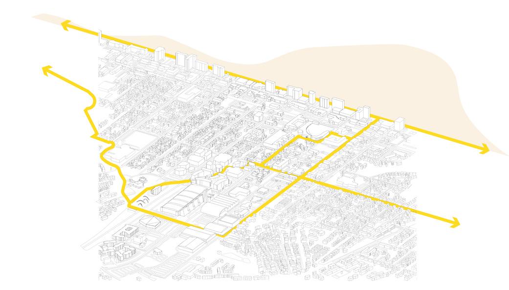 Detailed traffic pattern with designated truck routes, keeping heavy vehicular traffic beyond the band. The band primarily encourages shared or pedestrian streets that serve the creek as a public place through bridges, decks and cycle paths.