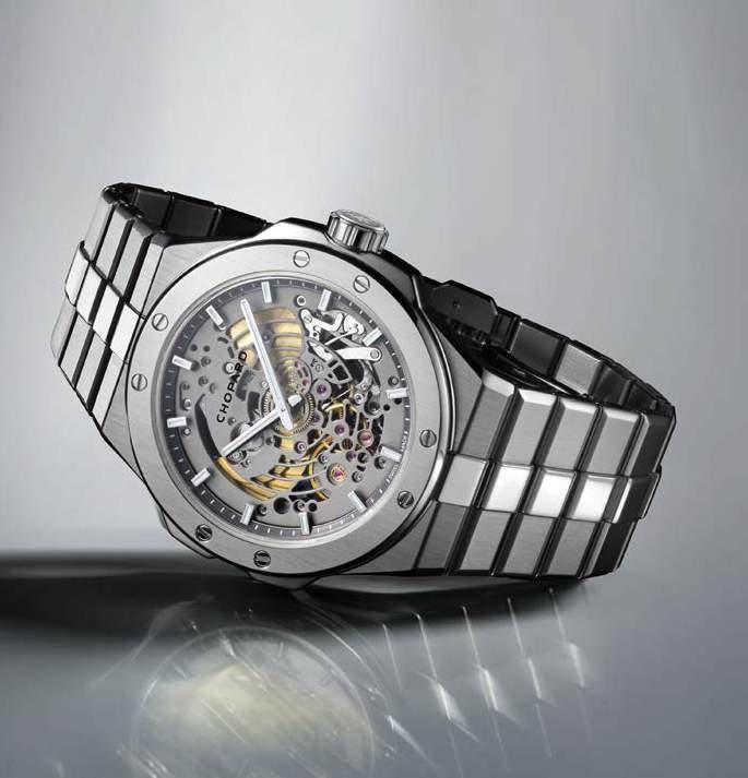 The collection welcomes a new ultra-thin timepiece providing full visibility across the entire intricate mechanical workings of L.U.C Calibre 96.17-S. This movement measuring a mere 3.30 millimeters thick showcases the finest expertise and innovation cultivated within Chopard Manufacture. From the 41 mm-diameter case to the integrated bracelet, the Alpine Eagle 41 XP TT is entirely made in Chopard’s workshops from grade 5 titanium, an extremely light metal boasting tried and tested resistance. Its optimal proportions and modernist design infuse this model with an undeniably technical character, while remaining faithful to the collection’s sporty aesthetic.