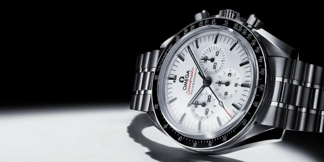 Presented on a polished-brushed bracelet, this 42 mm Moonwatch in stainless steel features sapphire crystal glass on the front as well as on the caseback. Inspired by the 4th generation Speedmaster style worn on the moon, it also includes an asymmetrical case, a white lacquered step dial with applied OMEGA logo and indexes, Moonwatch style hands, and the famous dot over 90 on the black anodised aluminium bezel ring.
