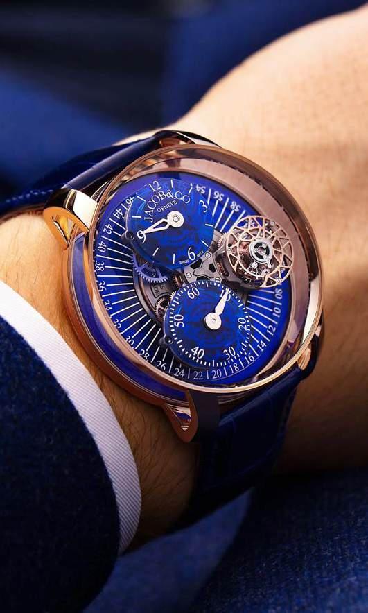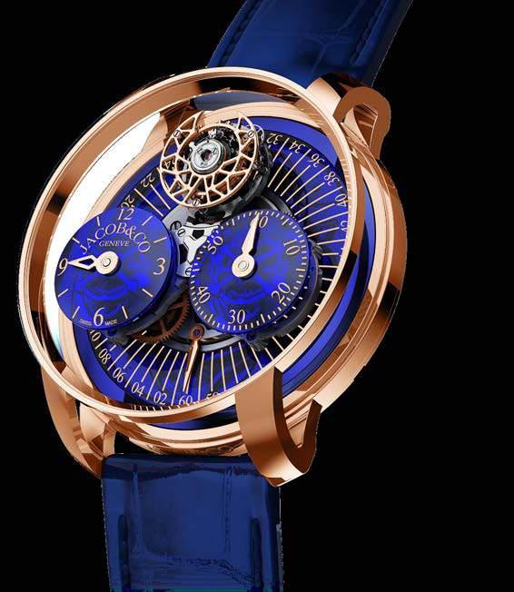 The 43-mm case is fitted with large panes of sapphire. In a world first, the 3D, rotating movement makes one full turn in 60 seconds. It has a separate hours and minutes display. The ring-shaped seconds dial spins counterclockwise in one minute. With Astronomia Regulator, Jacob & Co. offers a ground-breaking take on the Regulator, transforming a watchmaking classic with one of its signature twists.