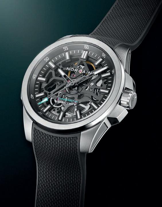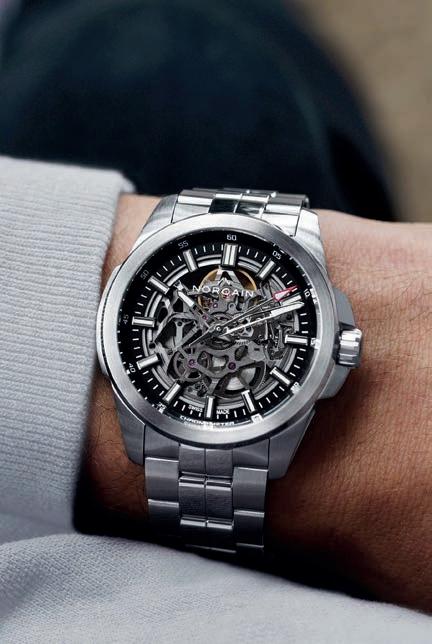 The Independence Skeleton showcases a striking skeletonised anthracite dial and a transparent main plate that reveals the inner workings of the robust, shock-resistant NORQAIN Calibre NB08S. This fascinating mechanical display is safeguarded by a sapphire crystal, ensuring exceptional clarity and enduring protection.