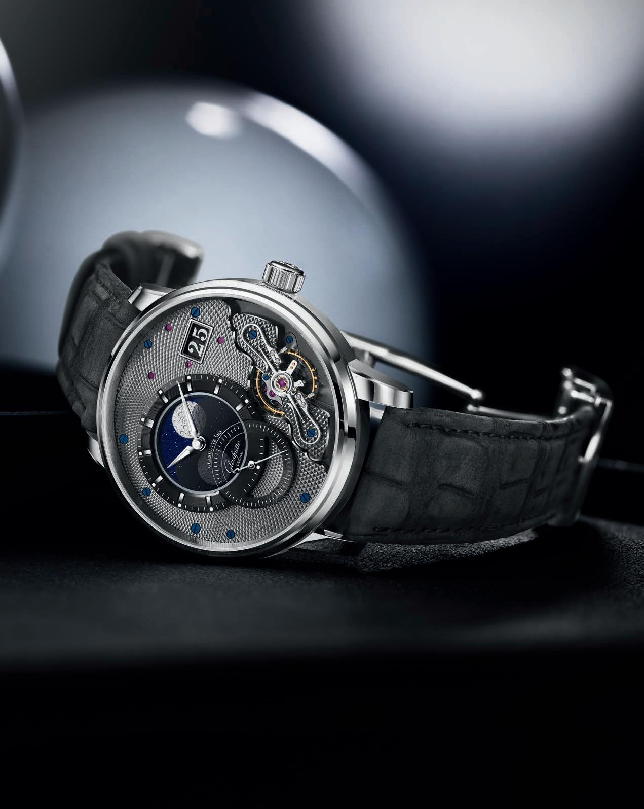 The slim bezel offers a generous view of the galvanic silver dial with a fine graining. Matching the case, the hour and minute hands are made of fine red gold, just like the handapplied Roman numerals. Display windows instead of hands ensure optimal readability and a clear design. The Panorama Date from Glashütte Original is also easy to read and rich in contrast: Arabic numerals in bold black stand out clearly against the ivory-coloured date discs.