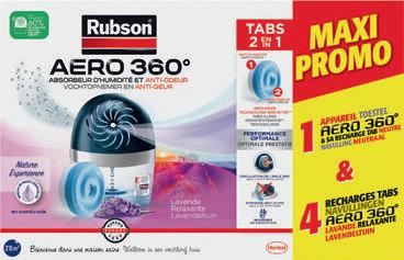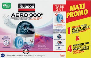 4 recharges tabs Aéro 360° Lavande + 1 appareil Aéro 20m² 360° + sa recharge tabs Neutre.