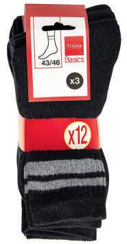 Compositions variables selon les modèles. 6€,95 LE LOT LOT DE 10 PAIRES DE CHAUSSETTES HOMME UC TACCHINI / Kappa: 68% Coton, 30% Polyester, 2% Élasthanne. Kappa : MC : 68% Coton, 30% Polyester, 1% Polyamide, 1% Élasthanne. MC gris : 63% Coton, 34% Polyester, 2% Polyamide, 1% Élasthanne. Du 39/42 au 43/46. Différents coloris et compositions disponibles selon les modèles.(1) 9€,30 LE LOT LOT DE 5 PAIRES DE CHAUSSETTES FEMME 60% Coton, 37% Polyamide, 3% Élasthanne Du 35/37 au 38/41. Différents coloris et compositions disponibles.(1) 3€,95 LE LOT JUNIOR HOMME FEMME POUR TOUTE LA FAMILLE B 84% Coton, 15% Polyamide, 1% Élasthanne. Du 39/42 au 46/48. Différents coloris disponibles.(1) 3€,15 - 30 % 4€,50(2) LE LOT LOT DE 3 PAIRES DE CHAUSSETTES HOMME 2€,95 MULE HOMME, FEMME OU ENFANT Dessus, Doublure, Première, Semelle: Textile. Du 28 au 46. Différents coloris disponibles selon la pointure.(1) TEXTILE À PRIX E.LECLERC 43