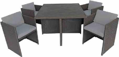 Structure en acier, et polyéthylène tressé. Coussins d'assise en polyester épaisseur 4cm. Ensemble composé de : 1 table avec plateau à lattes en aluminium de dim. L. 108 x l. 108 xH. 75,5 cm 4 fauteuils de dim. : L. 50 x l. 51 x H. 83 cm.