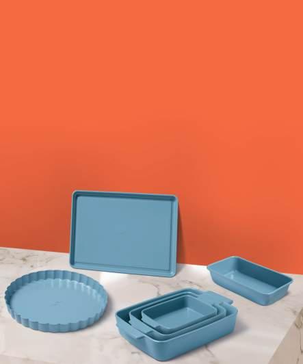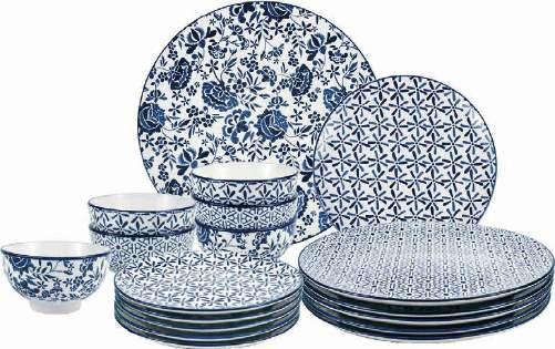 En porcelaine. Composition : 6 assiettes plates 27cm, 6 assiettes à dessert 19cm, 6 coupelles 11,5cm. 3 décors assortis mix and match.