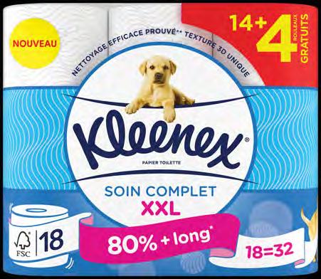 “KLEENEX” Au choix : Soin Complet XXL ou Dermo Douceur. 14 rouleaux + 4 rouleaux offert (18 rouleaux). Également disponible au même prix en variété Coussiné 19+5 (24 rouleaux).