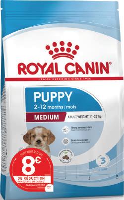 Aliment complet pour chiots de races moyennes (poids adulte de 11 à 25 kg). Jusqu'à 12 mois. 4 kg. Le kg : 6,98 €.