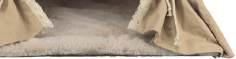 Dim. : 73 cm. Coloris : gris et noir. Lit douillet avec rebord rembourré. Abri habillé de fibre polaire (polyester) et coussin réversible (lavable à la main).