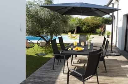 Structure en aluminium, plateau en verre trempé et toile en PVC tissé. Couleur : gris foncé.