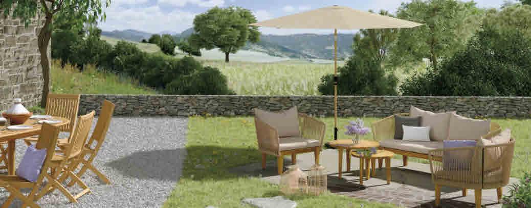 1 PARASOL DROIT 3M (1) 54,90 € • Mât et baleines en aluminium finition bois. Toile en polyester 180 gr/m². Dim. : Ø 3 m x H. 249 cm env. Ouverture par manivelle. Différents coloris(2) 2 SALON BAS 5 PIECES 499 € L'ensemble dont 11,93 € d'éco-participation mobilier • Structure en acacia. Coussins en polyester, 230 gr/m2,ép.7 cm, déhoussables et lavables en machine. Comprend : - 2 fauteuils : L. 76 x l. 69 x H. 69 cm, - 1 canapé : L. 158.5 x l. 69 x H. 69 cm, - 1 petite table : Ø. 50 x H. 35 cm, - 1 grande table : Ø. 60 x H. 40 cm.