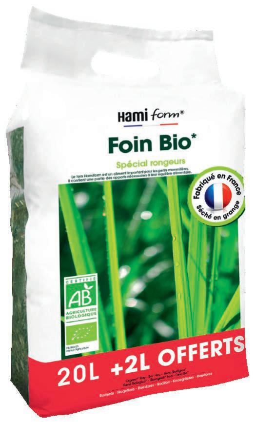 Le foin BIO Hamiform est un aliment important pour les petites mammifères. Il contient une partie des apports nécessaires à leur équilibre alimentaire: protéines, matières minérales et fibres. 20 L + 2 L o erts (22 L).