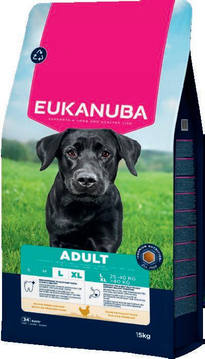 Riches en poulet frais. Aliment 100% complet et équilibré, idéal pour les chiens de grandes races âgés de 18 mois à 6 ans.