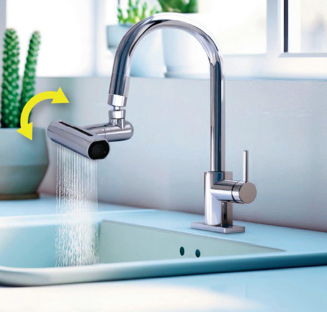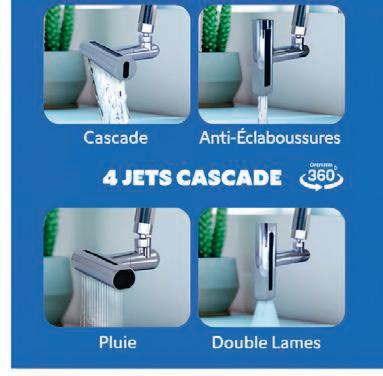 4 jets cascade : large, mousse, puissant, antiéclaboussures. Tête orientable à 360°. Orientation. Structure en ABS. S'adapte à tous les robinets. Installation en quelques secondes. Idéal pour la cuisine et la salle de bain.