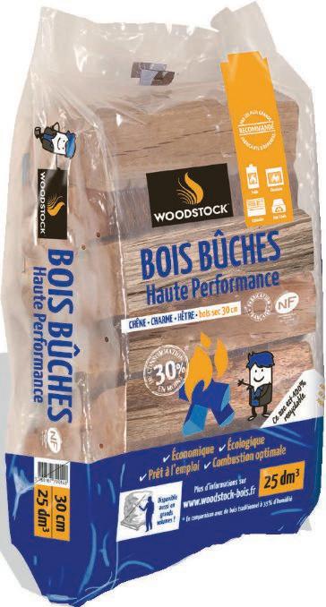Bûches : 30 cm. Sac de 25 dm3. Séchées à moins de 20 % d'humidité. Sans mousse, sans lichen, ni insecte. Haute performance calorifique.