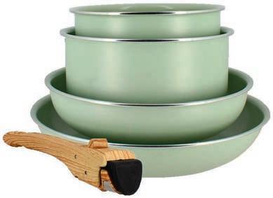 En aluminium et revêtement céramique. Coloris Céladon. Tous feux dont induction. Comprend: 2 poêles 22/26cm, 2 casseroles 16/18cm, 1 poignée avec finition bois.
