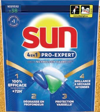 Bicarbonate ou Bio-Enzyme (26 lavages), Brillance ou Expert Plus (40 lavages), Citron Ecolabel ou Regular Ecolabel (46 lavages), Absolu Brillance ou Absolu Dégraissant (28 lavages), Expert Plus ou Expert Plus Citron (52 lavages)(4)