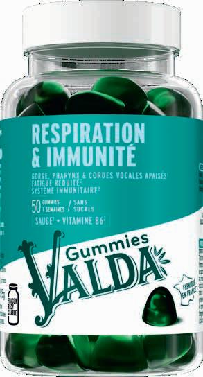 À base d’extraits de plantes, d’huile essentielle d’Eucalyptus Globulus et de Vitamine B6, les gummies Valda ont une formule complète pour prendre soin des voies respiratoires et qui contribue à réduire la fatigue à tout moment de l’année ! Notamment grâce à la sauge qui apaise la gorge et le phraynx en cas d’irritation des cordes vocales & de la vitamine B6 qui contribue à réduire la fatigue et contribue au bon fonctionnement du système immunitaire. Ces Gummies sont sans arômes ni colorants artificiels, sans sucres avec édulcorants, végan et fabriqué en France**