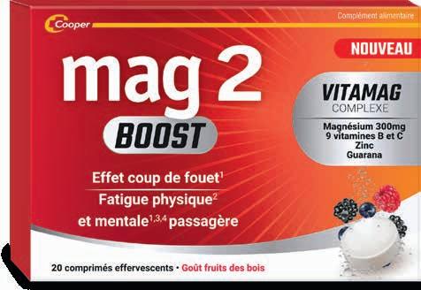 Refaites le plein d’énergie avec Mag2 Boost ! Mag2 Boost, c’est la solution rapide et efficace pour combattre la fatigue passagère dès qu’elle se fait ressentir notamment en période de stress. Sa formule complète associe de l’extrait de guarana, de la caféine et le complexe exclusif VITAMAG, composé de 300 mg de magnésium et de 9 vitamines B et C, pour un effet coup de fouet immédiat.