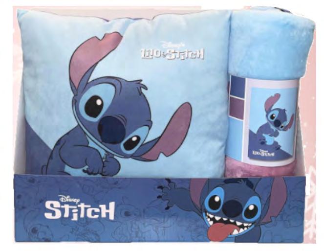 Ensemble couverture polaire 100 x 140 cm et coussin 35 x 35 cm. 100% polyester. Licence Stitch.
