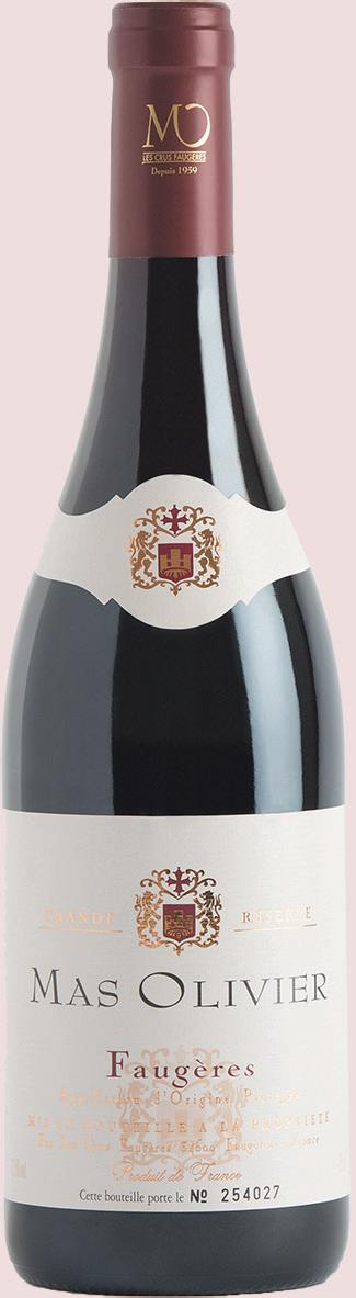 AOP(1) FAUGÈRES ROUGE MAS OLIVIER "GRANDE RÉSERVE" 75 cl. Le L : 5,80 €. Par 2 (1,5 L) : 6,52 € au lieu de 8,70 €. Le L : 4,35 €.