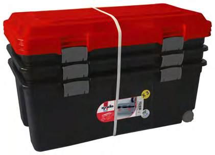 En polypropylène. Capacité 75 L. Dim. d'une malle : H. 34 x L. 80 x P. 40 cm. Avec 2 poignées, 4 clips de fermeture et deux roues à l'arrière.
