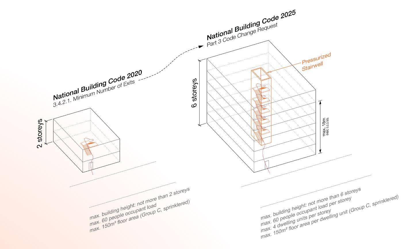 Conrad Speckert’s master thesis identifies what he calls “The wicked problem of the second egress” in Canada’s building code. For his research method, he documents the history of the building code and two means of egress in Canada, situates this issue within the missing middle densification, compares jurisdictions, proposes a code change, and reimagines by illustrating of how projects could be built with alternative circulation1.