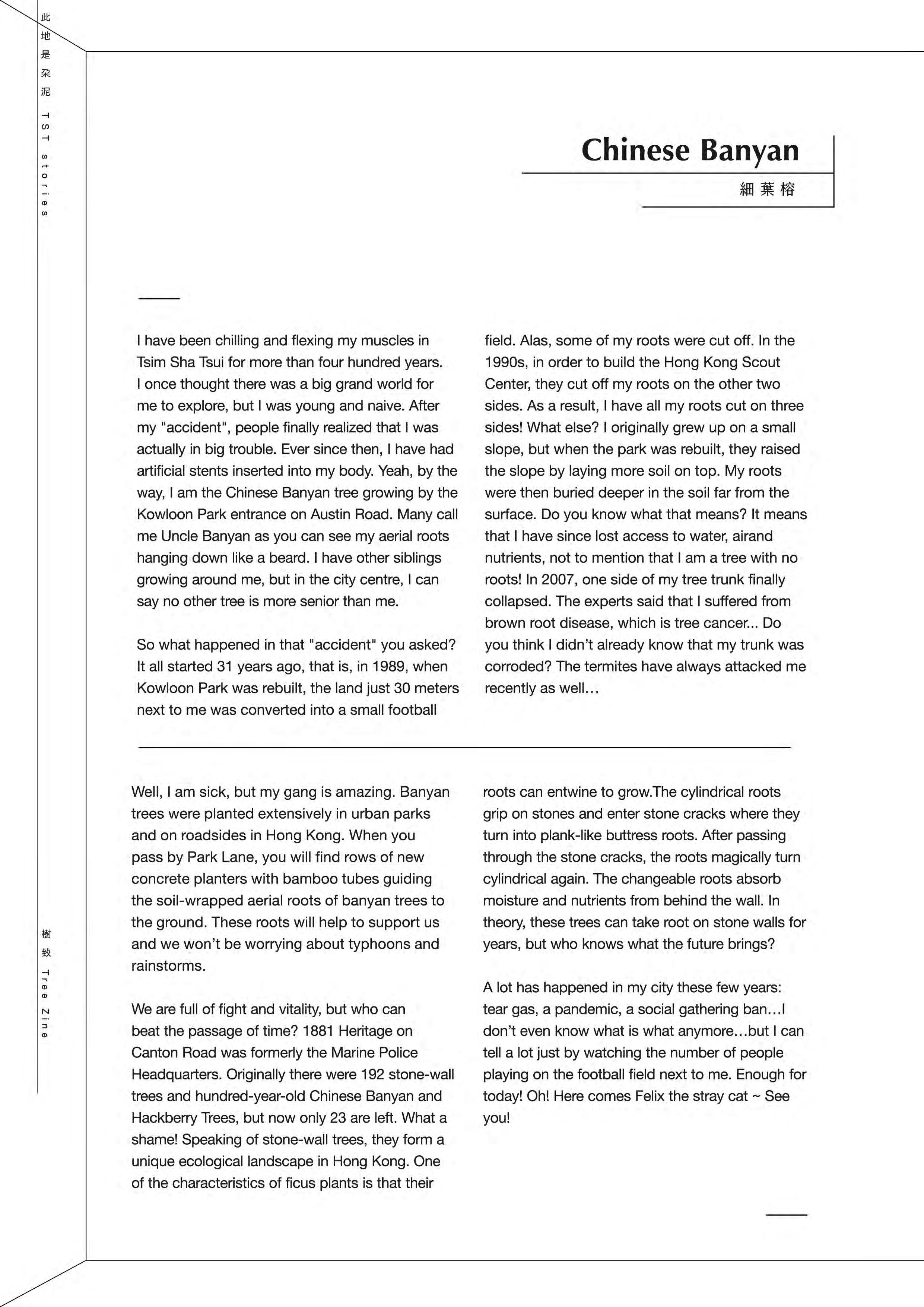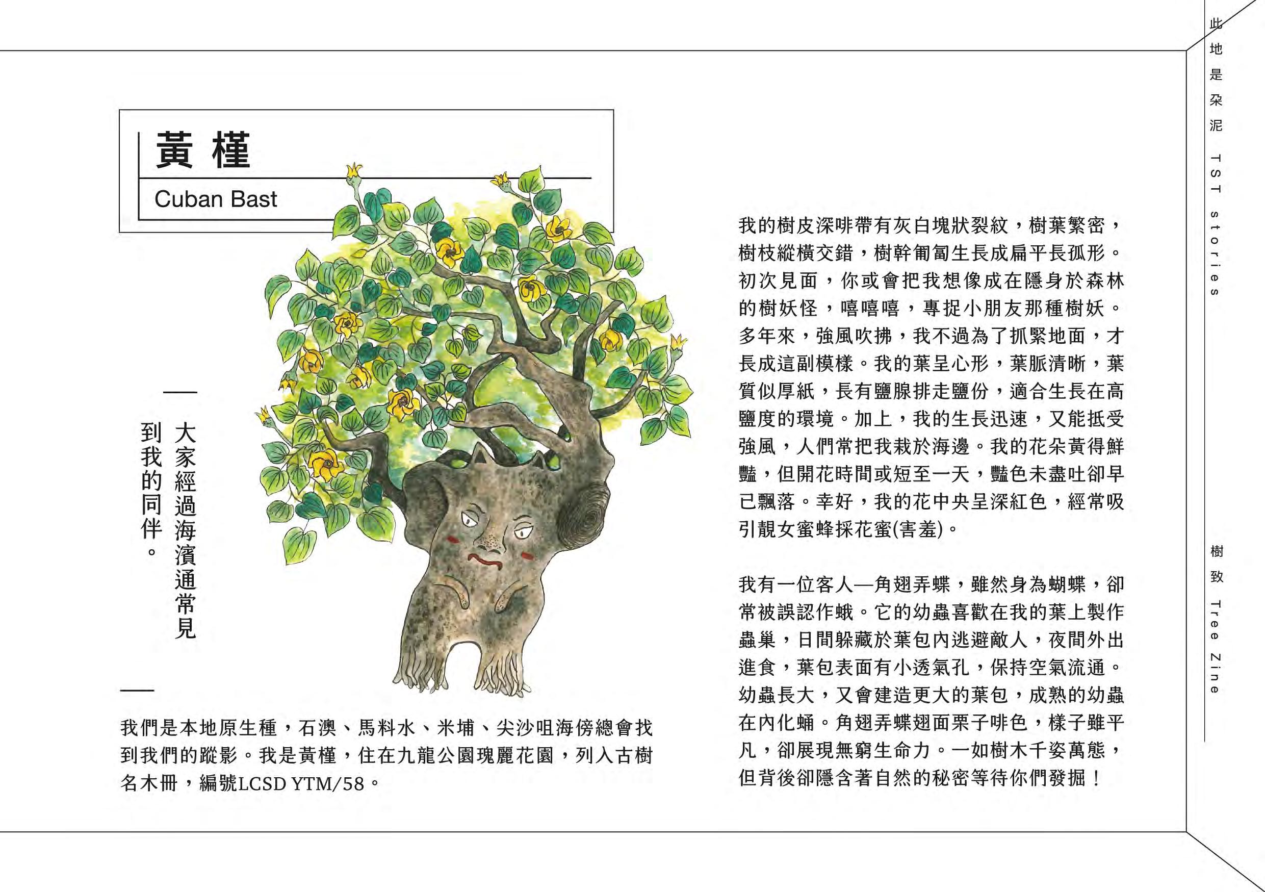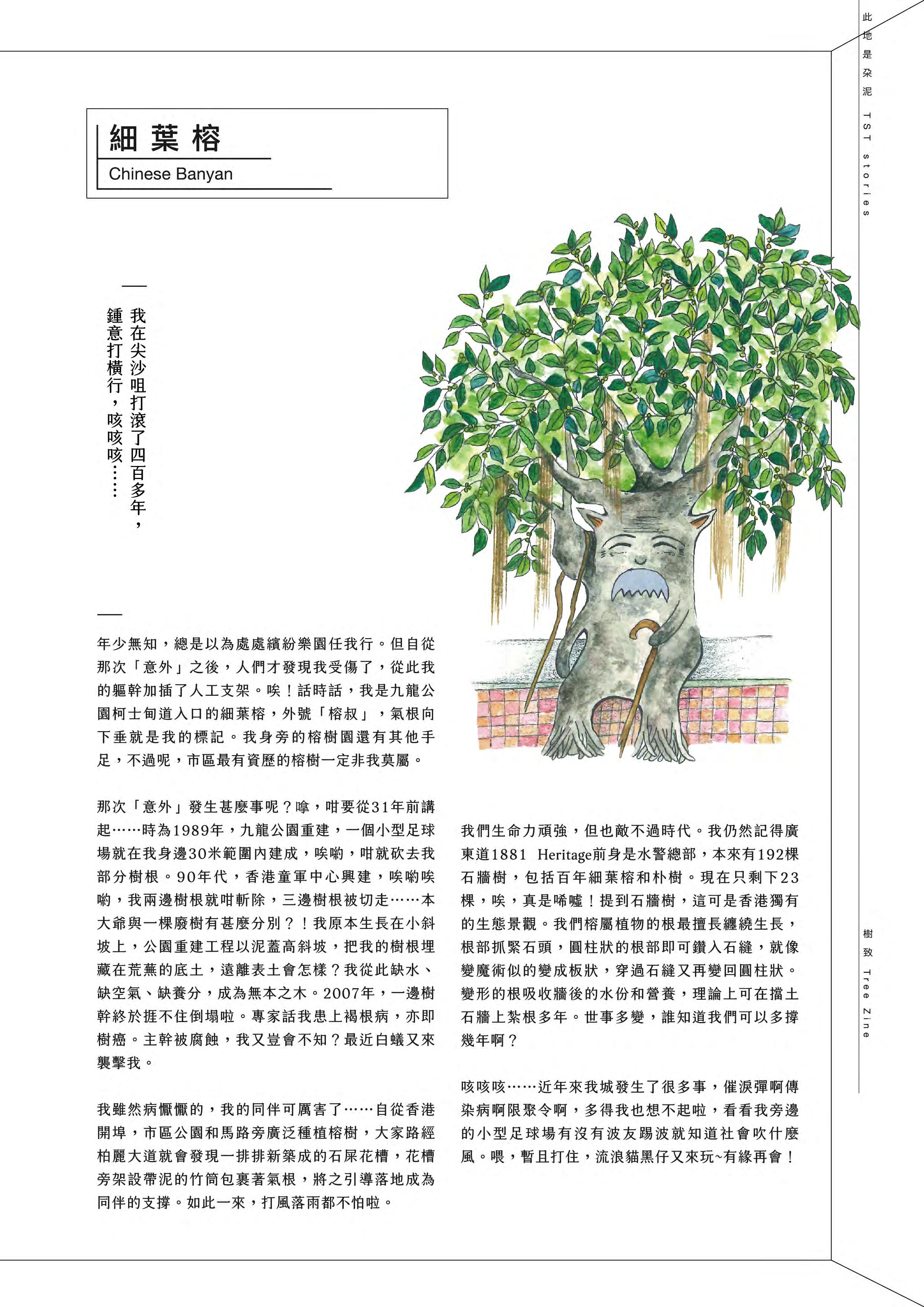 Tree Zine (co-authored with Ms Idy Lam, based on Rediscovering Tsim Sha Tsui 2020): This publication shifts the reader's perspective, initiating a dialogue with native and exotic urban trees by examining how they root, grow, and live within the cityscape. The work received positive reviews and is now a collection item of the M+ Library in the West Kowloon Cultural District, Hong Kong.