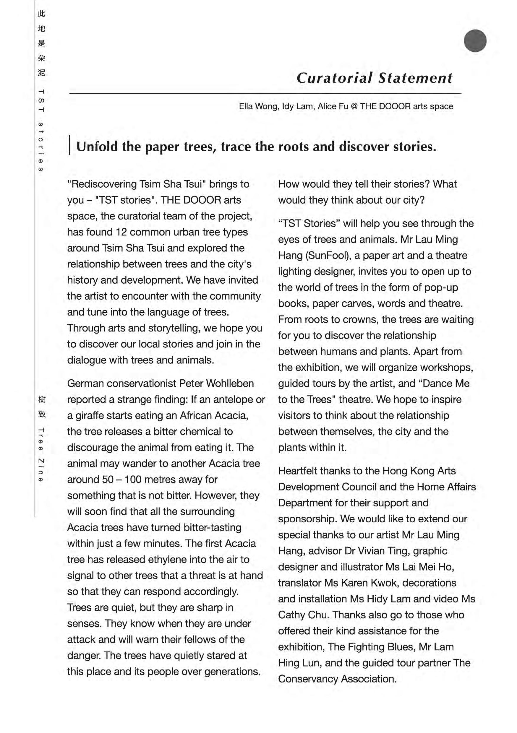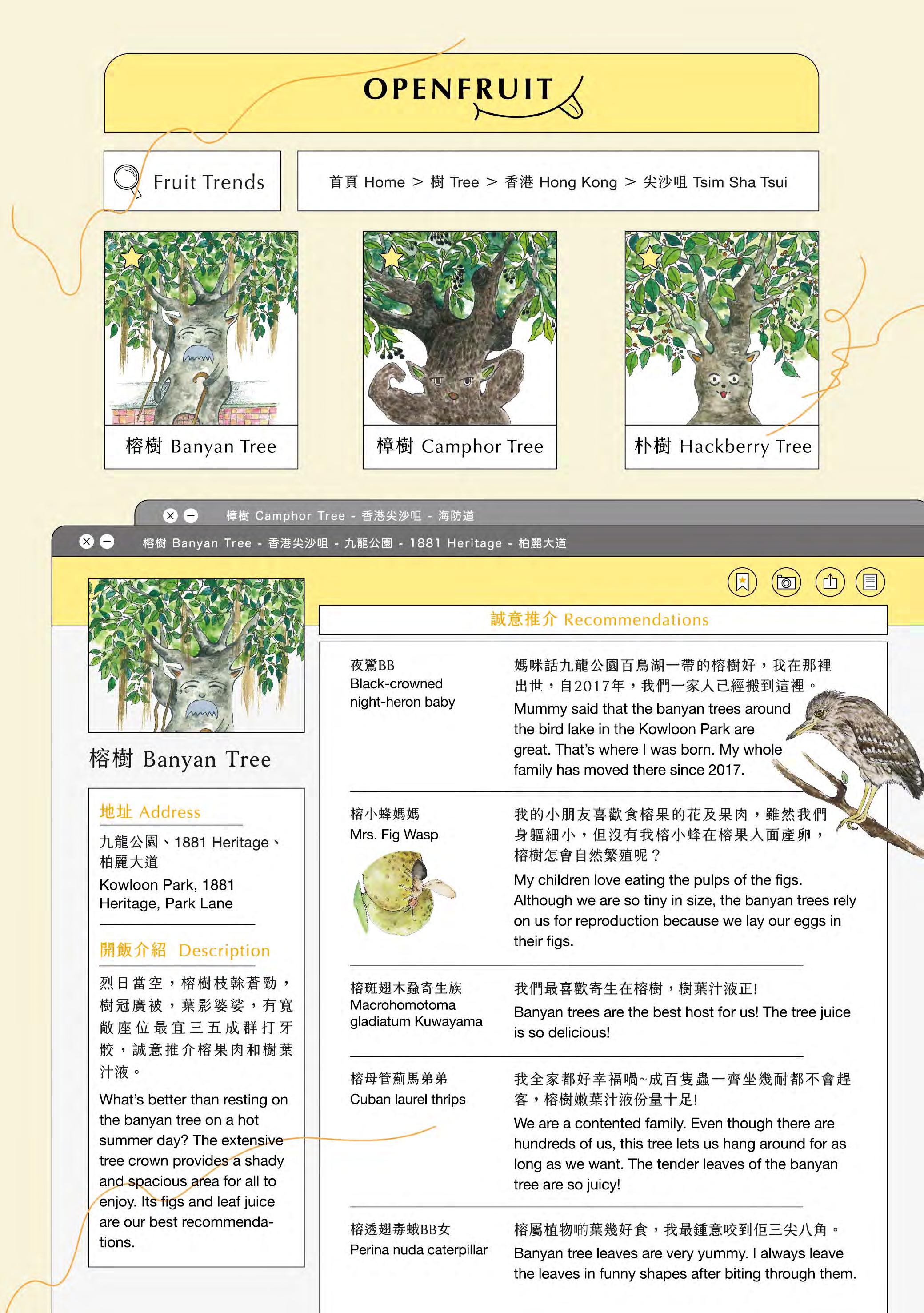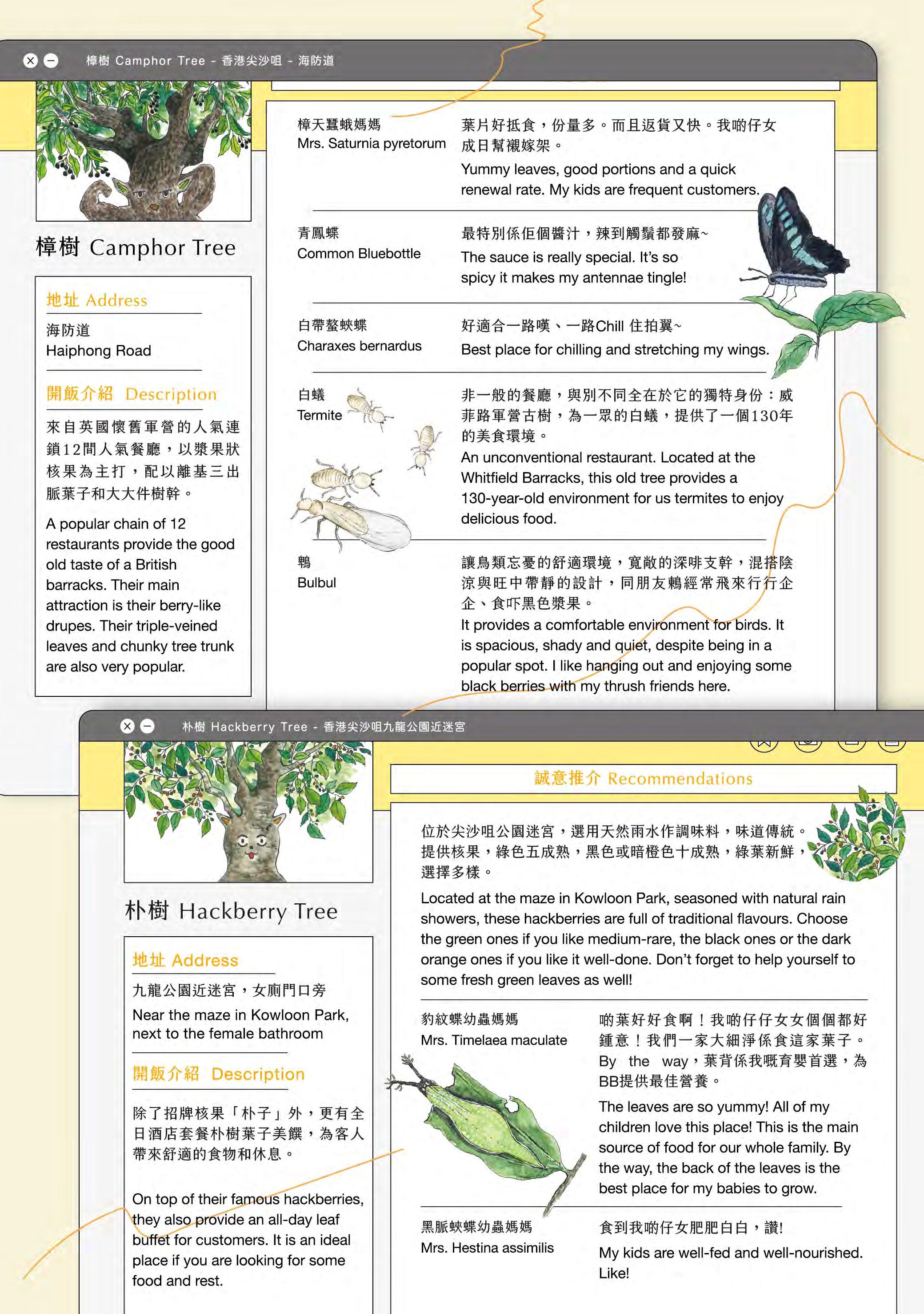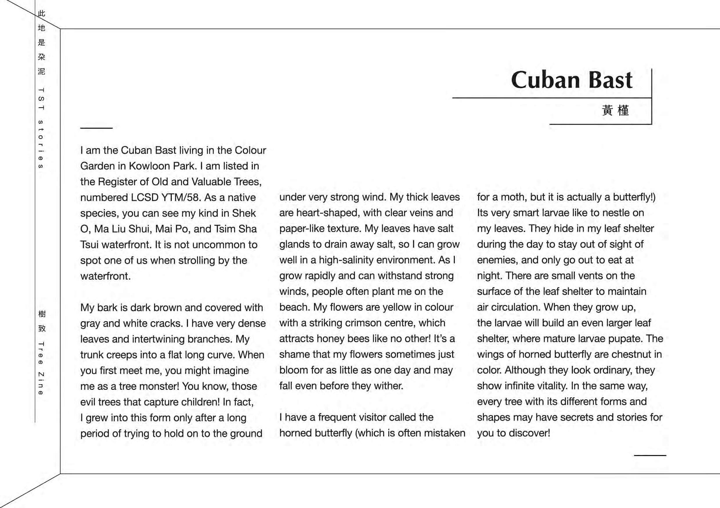 Tree Zine (co-authored with Ms Idy Lam, based on Rediscovering Tsim Sha Tsui 2020): This publication shifts the reader's perspective, initiating a dialogue with native and exotic urban trees by examining how they root, grow, and live within the cityscape. The work received positive reviews and is now a collection item of the M+ Library in the West Kowloon Cultural District, Hong Kong.