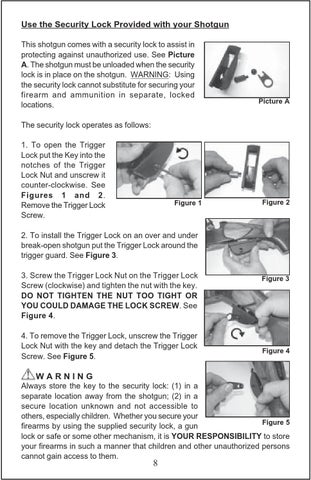 Use the Security Lock Provided with your Shotgun This shotgun comes with a security lock to assist in protecting against unauthorized use. See Picture A. The shotgun must be unloaded when the security lock is in place on the shotgun. WARNING: Using the security lock cannot substitute for securing your firearm and ammunition in separate, locked locations.