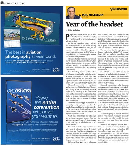 march toward ever more comfortable and quiet headsets, and the new Zulu PFX making its first AirVenture appearance is remarkably good. The new Zulu matches the Bose in price, and many of us who have tried it believe nothing is quieter or more comfortable than the Zulu PFX. But that’s a personal opinion. The newcomer in the super premium headset ranks is the AKG AV100. Austriabased AKG is a leader in microphones and headsets for the entertainment and recording industry. It also makes very popular headphones for personal entertainment listening. The company is part of the huge Harmon International Industries that makes high-end audio equipment for luxury autos and many other markets. The AV100 employs AKG’s decades of experience in headset design to create a very comfortable fit, at least for me. Its advanced ANR is pleasing to some, not as effective to others who have tried it. Put one on this week and see what you think. Bluetooth connectivity is a key feature in many expensive headsets so you can wirelessly listen to your personal devices or phone. Nearly all have the capability to lower the incoming entertainment volume when voices come over the intercom or airplane radios. This feature isn’t necessarily that popular with pilots, particularly if you fly IFR, because there is a lot of ATC communications to listen for. But passengers love the wireless Bluetooth link because all their electronic devices work perfectly in the airplane without a tangle of cords and connectors. So when shopping for headsets, be sure to include your primary passengers. Especially the one beside you who probably has some veto power over your flying and airplane spending. Stancie is the toughest headset critic I know, and I always make sure she flies a leg with a new headset before I write about it. If Stancie likes, I know many others will. Is a headset worth $1,100? Only you and your passengers can say for sure, and this week at Oshkosh is the place to try them all and make that important and increasingly large investment decision.