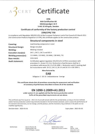 We comply with and are certified according ISO SS EN 9001 and SS EN 1090-1