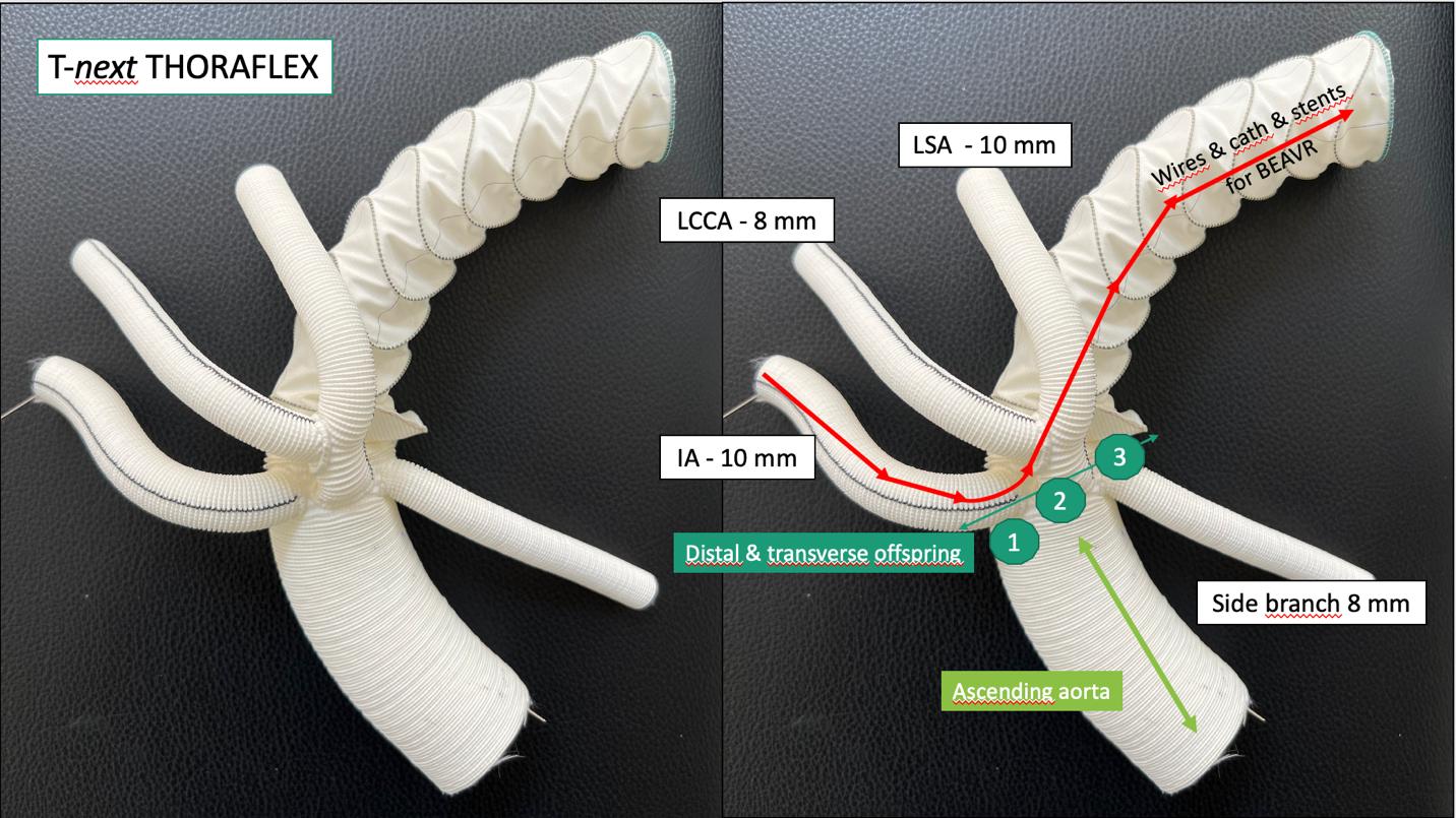 T-next is a modified Thoraflex graft with a new distal and transverse arrangement of the side branches that has been designed to simplify proximal root and distal endovascular thoracoabdominal secondary interventions (Fig 2) (1).