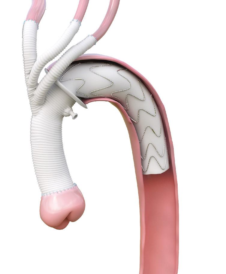 Unlike the conventional proximal-to-distal disposition of the neck-vessel branches, the T-NEXT graft features a distal and transverse arrangement of these branches. This design allows for a longer proximal graft segment, free from other prosthetic structures, and enables a more comfortable distal aortic clamping during root reintervention.