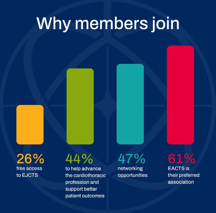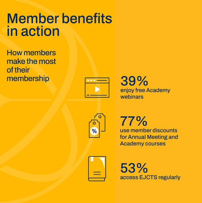 The results are testament to the high-quality benefits available to members including exclusive rates for the EACTS Academy programme, free access to scientific resources and networking opportunities. Over three-quarters of members take advantage of member discounts for the EACTS Annual Meeting and Academy courses and over half regularly access EJCTS.