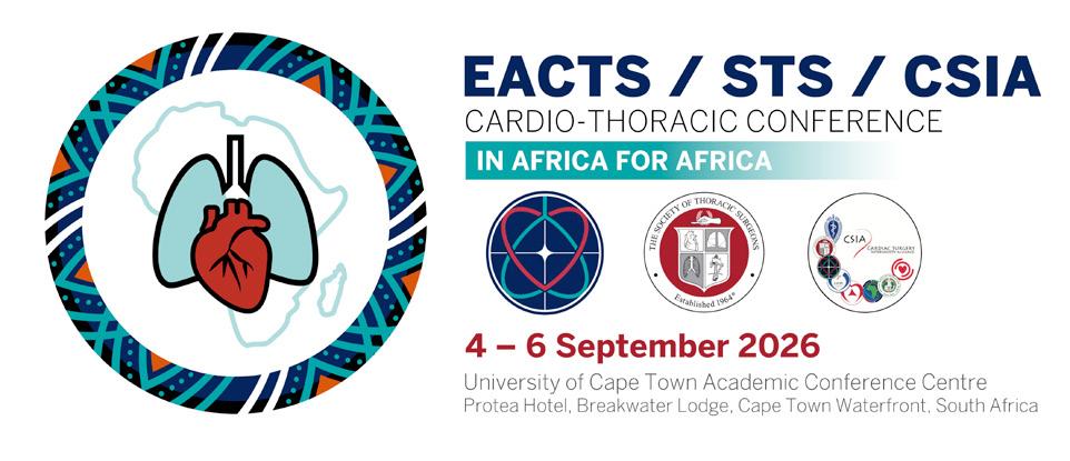 The European Association for Cardio-Thoracic Surgery (EACTS), the Society of Thoracic Surgeons (STS) and the Cardiac Surgery Intersociety Alliance (CSIA), in association with the Society of Cardio-Thoracic Surgeons in South Africa (SCTSSA), will be holding the inaugural African Cardio-Thoracic Conference in Cape Town from 4-6 September 2026. The Conference will bring together leading International and regional clinicians, fellows, and registrars to explore appropriate clinical approaches in cardiothoracic techniques in Africa. The programme will include plenary sessions with key invited speakers, surgical techniques, abstract submissions, and African database / registry opportunities; hands-on simulation models from the University of the Free State (UFS), rheumatic mitral valve repair and modified Bentall procedure.