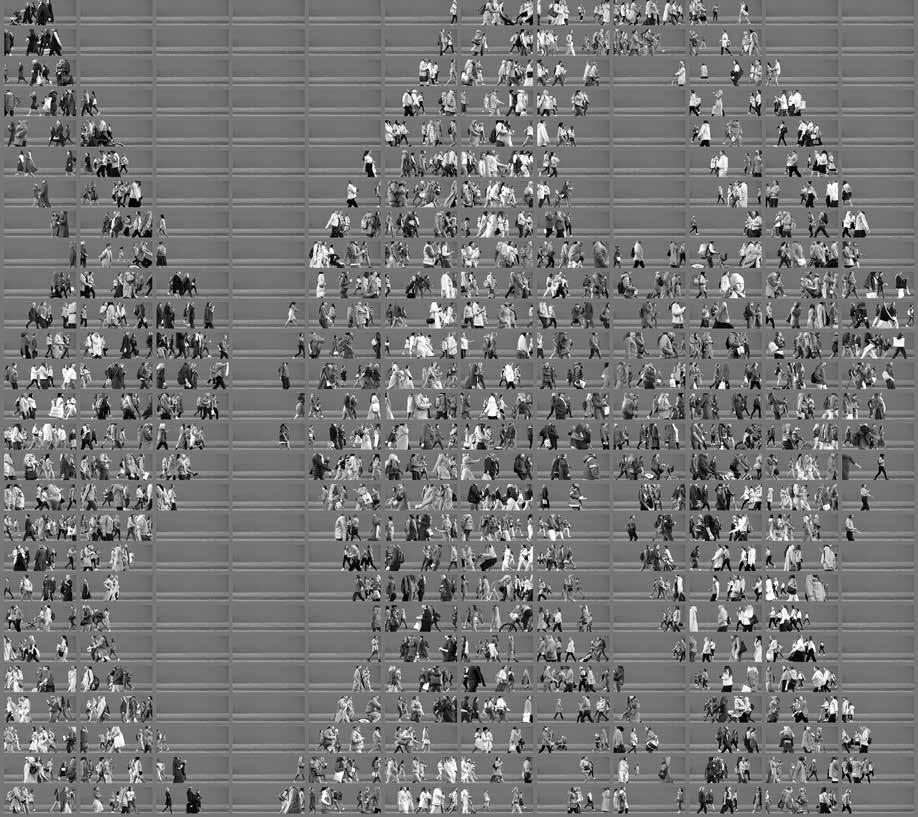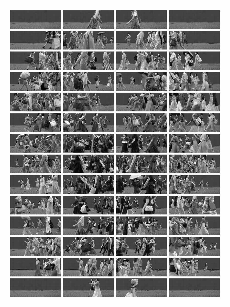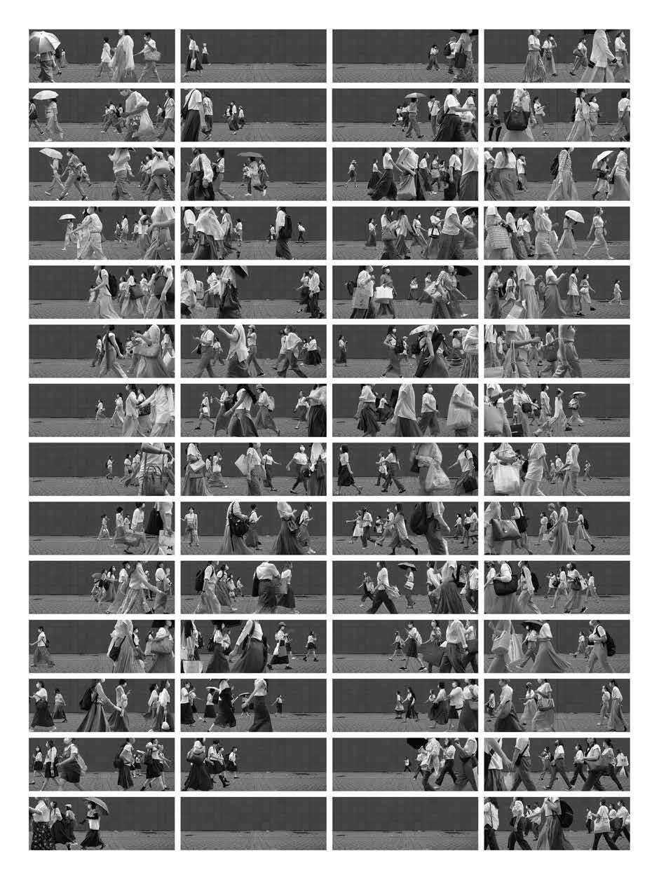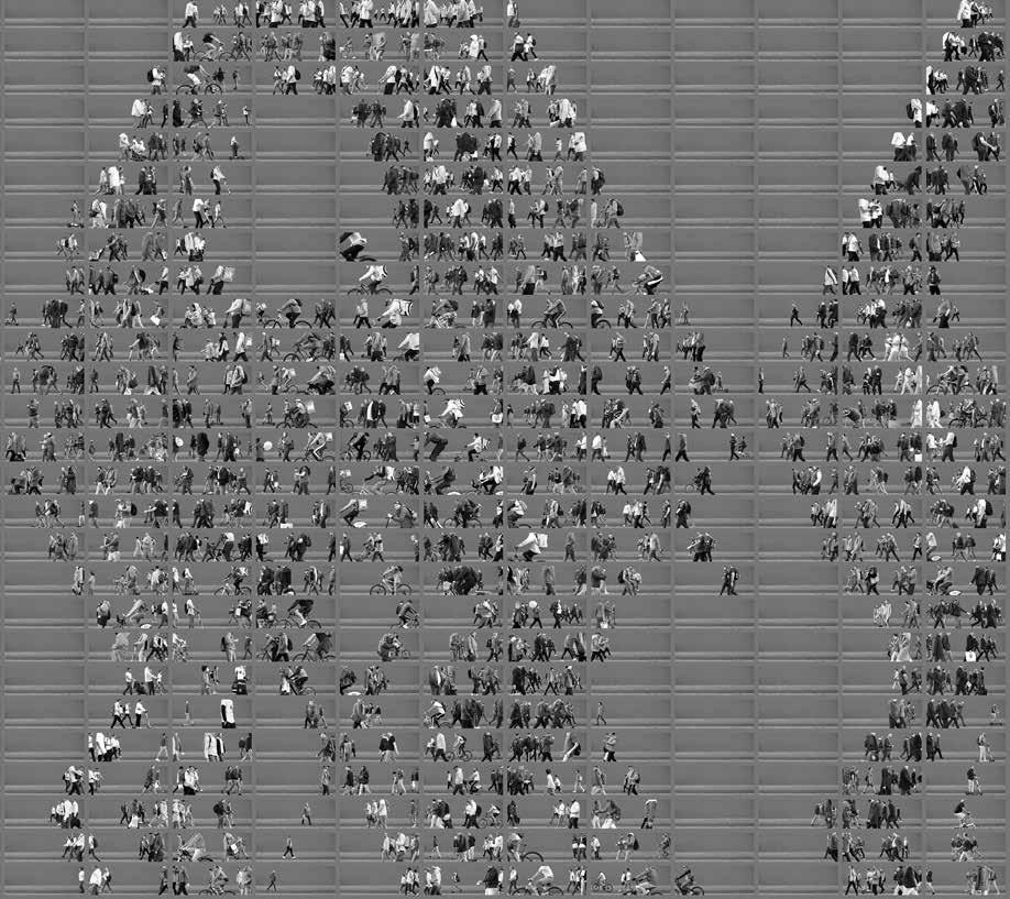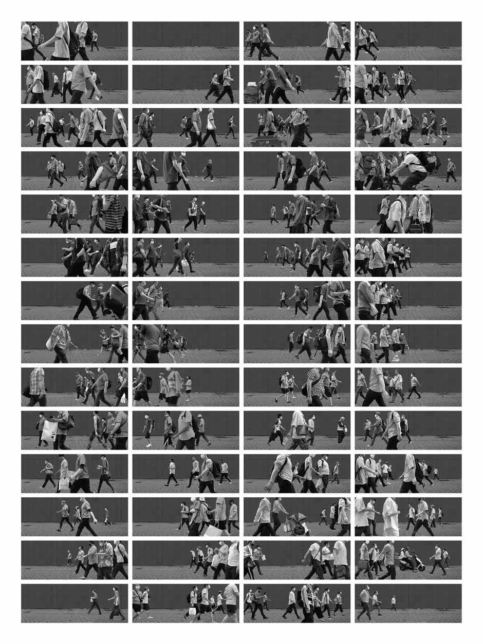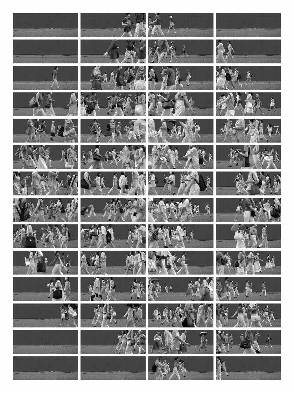Durante el curso de un día, una enorme comunidad de transeúntes fue capturada en video. El ejercicio fotográfico consistió en destacar a cada individuo por separado, organizarlos por patrones y localizarlos digitalmente en una cuadrícula de gran formato.