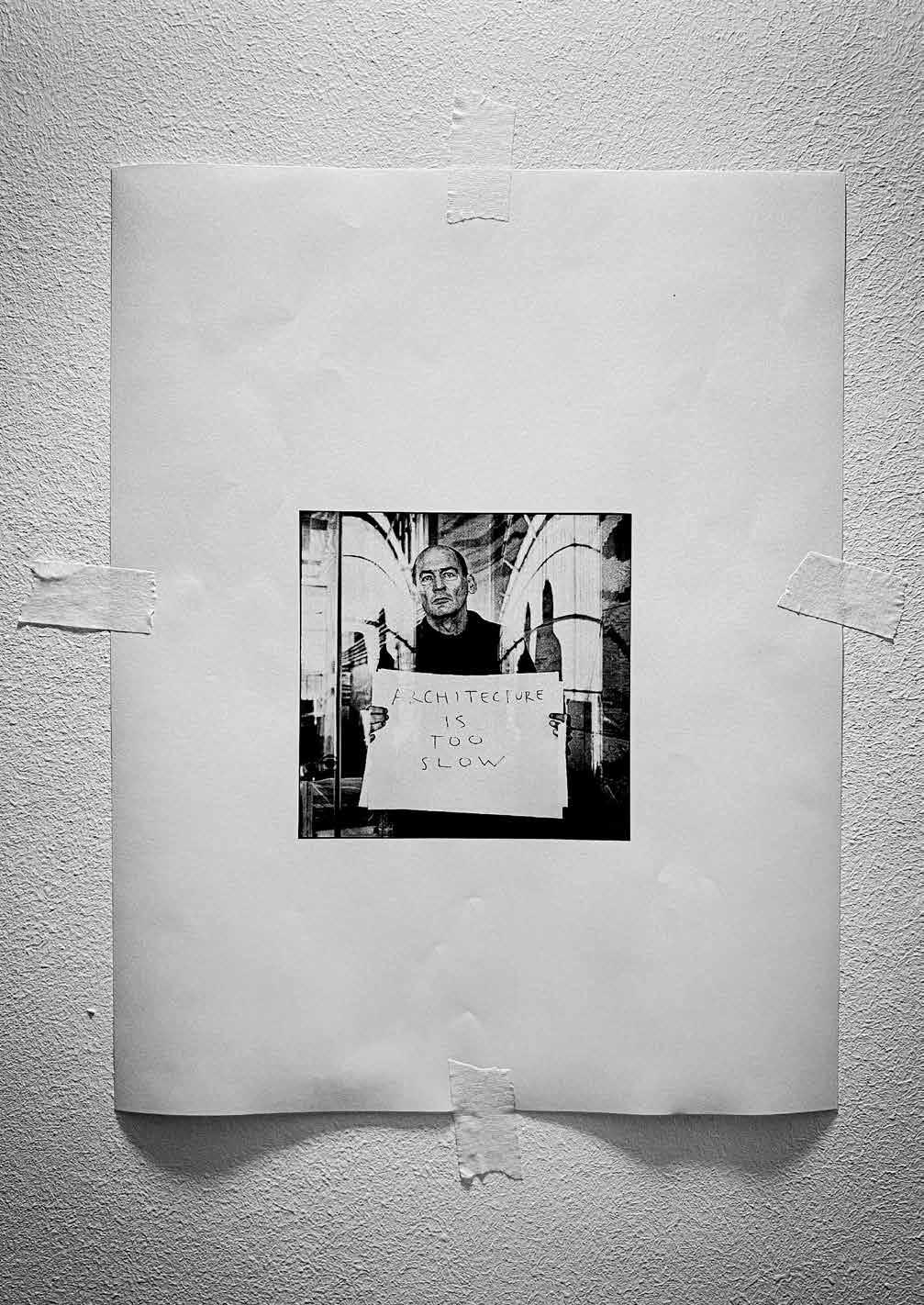 En 2005, el fotógrafo Steve Pyke retrató a Rem Koolhaas, de aproximadamente 60 años, parapetado tras el cristal ondulado de los ventanales del auditorio de la Casa da Música en Oporto en actitud de protesta, sosteniendo entre sus manos varios pliegos en los que se lee, en mayúsculas, la sentencia: ARCHITECTURE IS TO SLOW, explicada en uno de los párrafos del perfil del arquitecto elaborado para The New Yorker, que entendemos motivó esta fotografía.