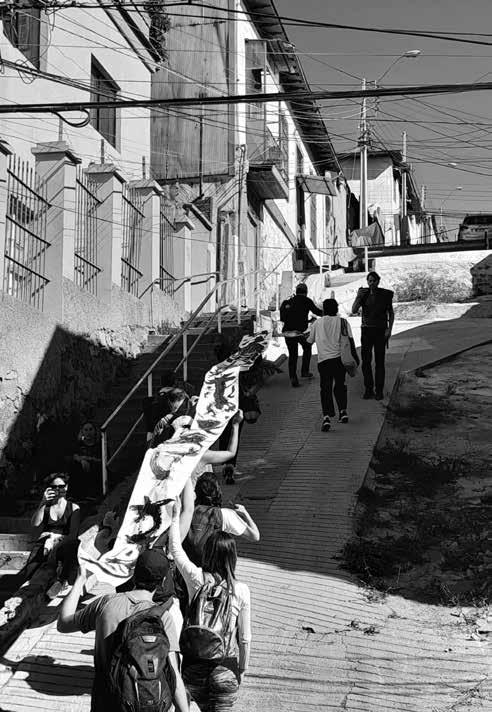 agrupación de huérfanos arrojados a su suerte. Al inicio cuesta andar juntos sin guías, la costumbre embrutece, algunos se confunden, preguntan dónde está Careri. En fin, trazamos algunos puntos de encuentro que luego abandonaremos. Avanzamos en grupos que se dispersan por plazas, escaleras, miradores y quebradas, buscando forzar pasajes cerrados, deleitarnos en ascensores abandonados, capturar palabras inscritas en los muros. Una tradición proveniente de la Travesía arquitectónica nos empuja a la acción, a levantar un hito. Comenzamos por la voz: Floro, parado en medio de la calle, lee crónicas de una experiencia poética. Enseguida, nos invita a desplegar un rollo de papel y lanzar chorros de tinta negra. Pienso en Pollock, porque el papel desplegado en el suelo obliga a encorvarse y a mover los brazos tirando tinta de un lado a otro en una especie de danza. En eso se convierte nuestra deriva unas cuadras más arriba: en un baile que efectuamos en las alturas de un cerro mientras nos empujamos unos a otros tomados de nuestros codos. Después de estos eventos, somos un solo grupo que avanza hacia las últimas calles de la ciudad, somos menos también. Arribados al sector más alto de Valparaíso, nos adentramos por senderos semiurbanos que nos llevan entre edificios, matorrales, eucaliptos y alambre de púa. Luego, todo es cuesta abajo. Llegamos al Pajonal, ahí, en el parque Merced hacemos una última pausa. En una especie de anfiteatro, leo un poema y los aplausos sirven para empezar a retornar. De aquí en adelante, la cuadrilla aventurera que somos camina dispersándose ligeramente, sabiendo que en un límite imperceptible de la deriva ha hecho un trueque: el de lo conocido por lo desconocido, donde cada uno se renueva y se pierde. Enrique Morales