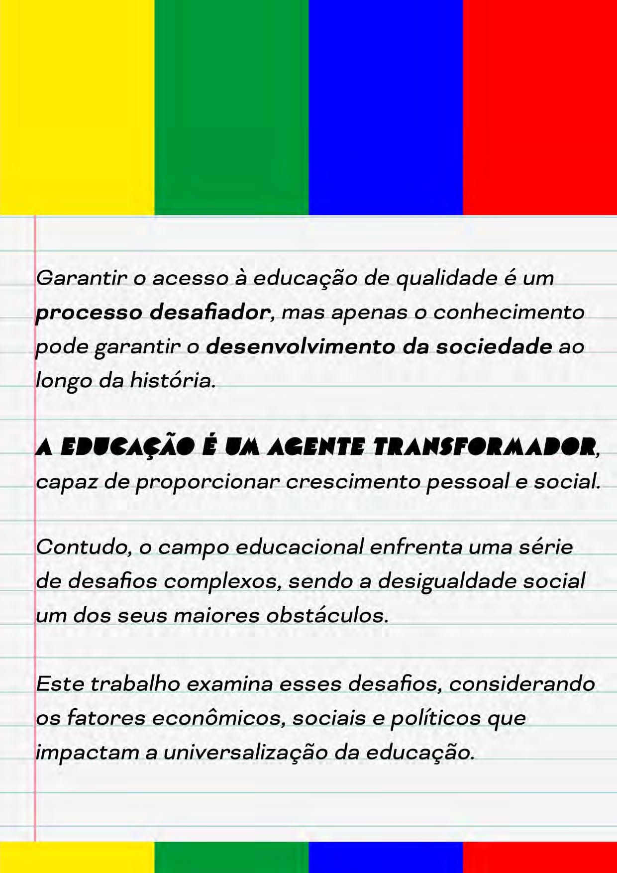 A disparidade entre esses dois mundos é um reflexo das desigualdadessociaisquepermeiam o sistema educacional, criando uma realidade em que o acesso à educação de qualidade é muitas vezes determinado pela localização geográficaoupelopoderaquisitivoda família.