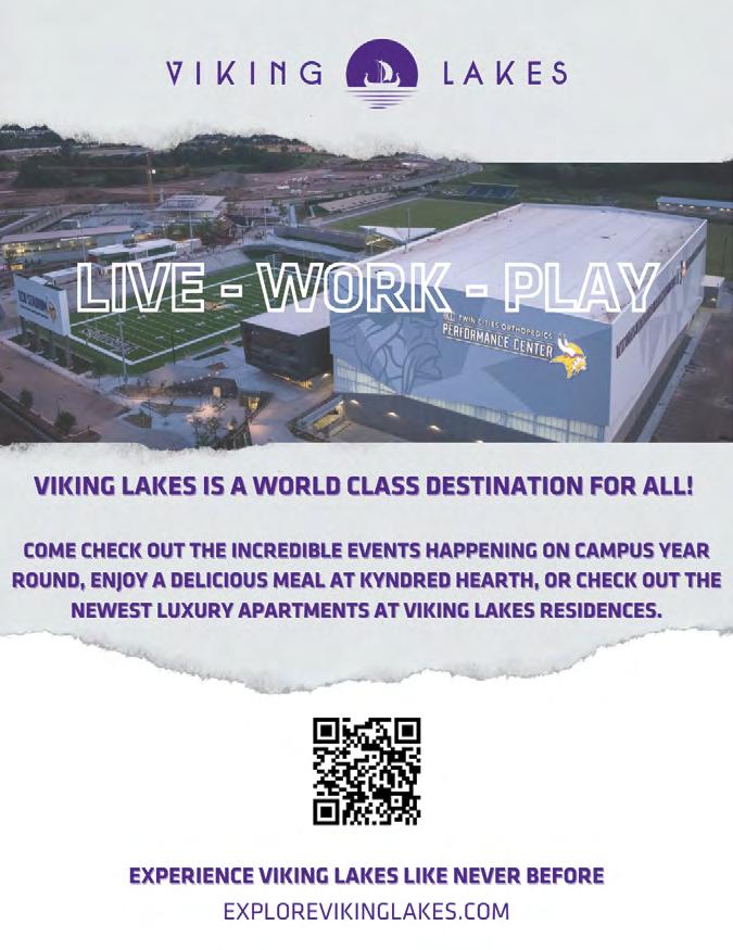 Viking Lakes is a vibrant, multifaceted development that serves as the headquarters and training facility for the Minnesota Vikings. At its heart lies the cuttingedge TCO Performance Center, featuring world-class training facilities, practice fields, and a modern office complex for the team. More than just a sports hub, Viking Lakes is a dynamic mixed-use community offering residential living, retail spaces, and the luxurious Omni Viking Lakes Hotel. The development also features expansive green spaces, walking trails, and a central plaza, creating a welcoming destination for recreation and events like Winter SKOLstice, home to the world’s largest ice maze. Combining sports, lifestyle, and community, Viking Lakes exemplifies how professional sports can drive local growth and enrich the Eagan community.