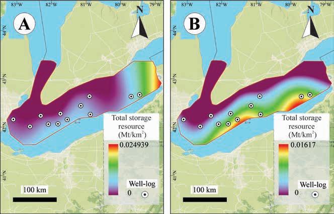 Figure 5 Calculated repository potential of the COSS injection interval in eastern Ontario. A) Total storage resource for the sandstone repository. B) Total storage resource for the sandstone and dolostone repositories.